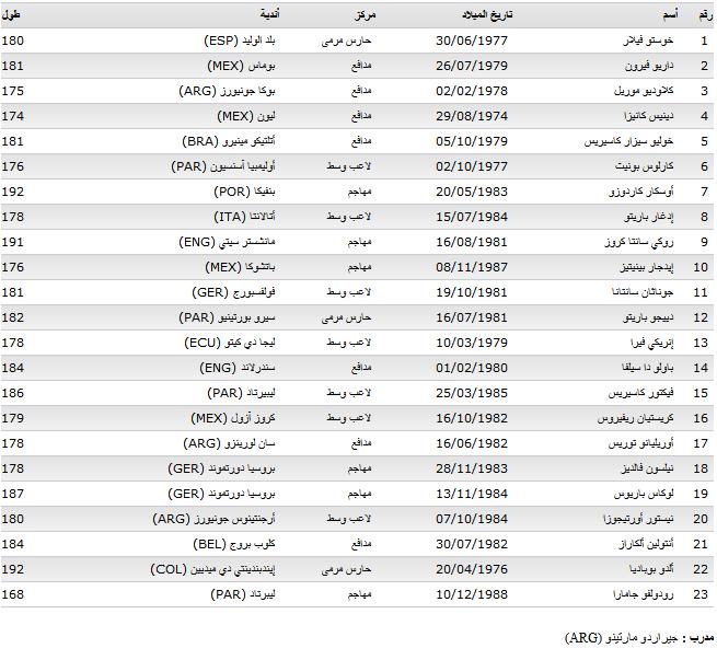 حيث كون المدرب السابق لنادي أتليتيكو مدريد فريقا يجمع بين المواهب الشابة والنجوم الكبار، وحول مسار منتخب الألوان الثلاثة تماما. ونجح في قيادة المنتخب ليرتقي من المركز الخامس إلى الثاني في ترتيب منطقة أمريكا الشمالية والوسطى والكاريبي، بتحقيق خمسة انتصارات والتعادل في مباراة واحدة والخسارة في مباراة واحدة في مشوار التصفيات. وتطمح المكسيك إلى تجاوز دور الستة عشر في جنوب أفريقيا 2010، تلك المحطة التي توقفت عندها في بطولات كأس العالم FIFA الأربع الماضية. الطريق إلى جنوب أفريقيا 2010 بعد التغلب على بليز بلا مشقة في المرحلة الأولى من التصفيات، وقعت المكسيك في مجموعة صعبة في المرحلة قبل النهائية. وكانت المواجهات مع جامايكا وكندا وهندوراس أقوى مما كان يتوقع الفريق الذي كان يقوده عندئذ سفين جوران إريكسون، ولم يتأهل إلا بفضل فارق الأهداف الذي تفوق به على جامايكا. وبدأ المنتخب المكسيكي المرحلة النهائية، التي تتنافس فيها ستة منتخبات، بنفس الطريقة المضطربة. فجاء الفوز على كوستاريكا (2 - 0) والهزيمتان في الولايات المتحدة (2 - 0) وهندوراس (3 - 1) ليجد المكسيكيون أنفسهم مضطرين لتغيير إدارة الفريق. فذهب إريكسون وجاء خافيير أجيري، الذي كان قد تولى مسئولية الفريق من قبل في ظروف مماثلة في طريقه نحو كوريا واليابان 2002. وكرر أجيري المعجزة، وبعد الكبوة المؤلمة في السلفادور (2 - 1)، صنع تغيرا جذريا في حظوظ منتخب الأزتيك. حيث نجح بانتصاراته المتتالية أمام ترينيداد وتوباجو (2 - 1)، والولايات المتحدة (1 - 0)، وكوستاريكا (0 - 3)، وهندوراس (1 - 0)، والسلفادور (4 - 1) في حجز تذكرة المكسيك إلى المونديال قبل مباراتهم الأخيرة في التصفيات، التي لعبوها بأعصاب هادئة، وتعادلوا فيها مع ترينيداد وتوباجو (2 - 2)، ليحتلوا في النهاية المركز الثاني في ترتيب المنطقة. أبرز النجوم إذا كان الفضل في التحول الذي شهده المنتخب الأخضر يرجع للاعب واحد، فإن هذا اللاعب هو كواوتيموك بلانكو، ذلك المخضرم المبدع الذي أعاده خافيير أجيري إلى المنتخب بعد اعتزاله اللعب الدولي، وأصبح رمزا للمنتخب المعاد بنائه. وتألق إلى جانبه شباب مثل جييرمو أوتشوا، وإفراين خواريث، وأندريس جواردادو، وجوفاني دوس سانتوس، الذين سيشكلون إلى جانب قائد الفريق رافائيل ماركيز قوة المكسيك الضاربة في جنوب أفريقيا 2010. المدرب خافيير أجيري هو أكثر المديرين الفنيين المكسيكيين نجاحا في السنوات الأخيرة. فبعد أن كان نادي باتشوكا مغمورا لا يعرفه أحد، جعله بطل كرة القدم في أرض الأزتيك عام 1999، ثم تولى مسئولية المنتخب المكسيكي الذي كان قد فقد الأمل في التأهل لنهائيات كوريا واليابان 2002. ولم ينجح في تأمين تذكرة المشاركة في المونديال فحسب، بل وصل بالفريق إلى دور الستة عشر أيضا، متربعا على قمة المجموعة التي كانت تضم إيطاليا وأيرلندا والإكوادور. وبعد البطولة وقع عقدا مع أوساسونا الأسباني، الذي قاده إلى دوري أبطال أوروبا في موسم 2005 - 2006. ثم انتقل إلى أتليتيكو مدريد، الذي أنهى معه موسم 2007 - 2008 في المركز الرابع في الدوري الأسباني. وترك الأتليتيكو في أوائل عام 2009 وعاد إلى المكسيك التي كانت تعاني الأمرين مرة أخرى. وهو الآن، بعد أن أنقذ بلاده للمرة الثانية، يستعد لاستكمال سجله المشرف في جنوب أفريقيا 2010. تاريخ المنتخب في كأس العالم - تأهلت المكسيك لنهائيات كأس العالم FIFA 14 مرة، متفوقة على كل منتخبات الكونكاكاف. - أفضل مركز حصلت عليه المكسيك في نهائيات كأس العالم FIFA هو المركز السادس الذي نالته في البطولتين اللتين نظمتا في بلاد الأزتيك، المكسيك 1970 و1986. - سوف تكون بطولة جنوب أفريقيا 2010 هي المرة الخامسة على التوالي التي يتأهل فيها المكسيكيون إلى نهائيات المونديال. وفي البطولات الأربع السابقة، خرجت من دور الستة عشر. إحصائيات - في عهد أجيري، نجحت المكسيك في خوض 12 مباراة متتالية دون أن تمنى بهزيمة واحدة، ولم يوقف هذه المسيرة الناجحة إلا الخسارة في مباراة ودية أمام كولومبيا (2 - 1)، شارك فيها لاعبو